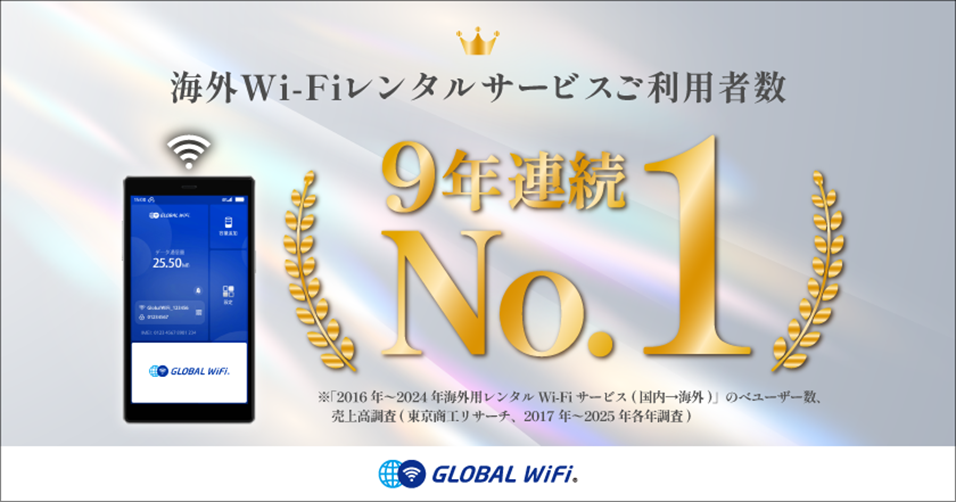 「グローバルWiFi®」が海外用Wi-Fiレンタル市場において 9年連続利用者数No.1を達成。