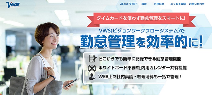 VWS (ビジョンワークフローシステム)は勤怠管理機能、社内用カレンダー共有機能、社内稟議・経費精算システムが1つになった業務効率化・営業支援ツールです。