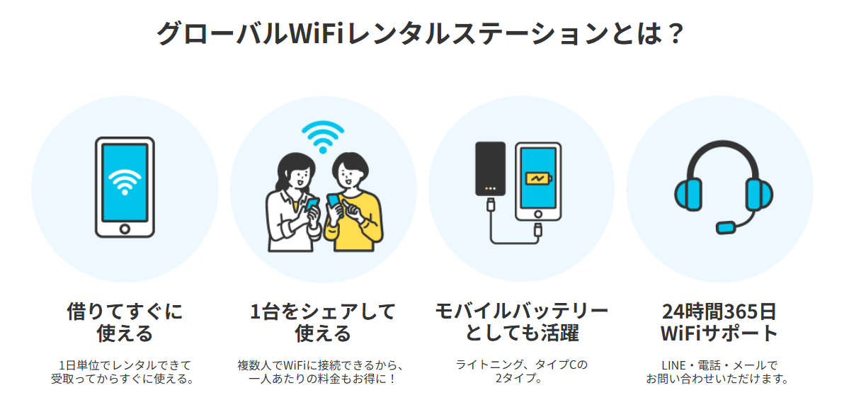 「グローバルWiFi®レンタルステーション」は、その場で借りてすぐに使えるモバイルWi-Fiレンタルサービスです。1台で国内はもちろん、海外145の国と地域でご利用いただけます。モバイルバッテリーとしてもご活用可能です。