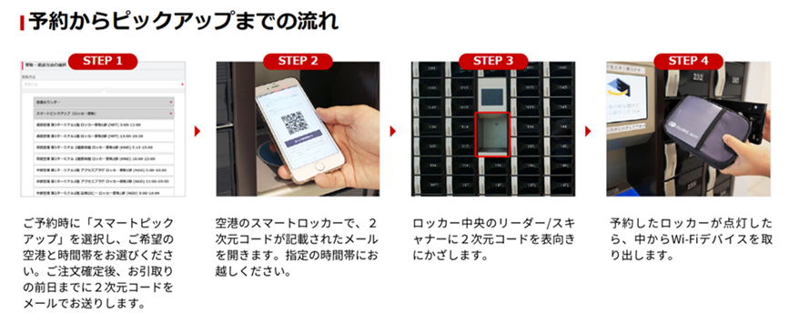 ・機器受取/返却方法:空港カウンター(国内10空港、うち7空港に「スマートピックアップ」ロッカー設置)、宅配(日本全国)、観光案内所・施設(20か所)、営業所(2か所)